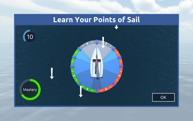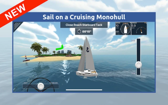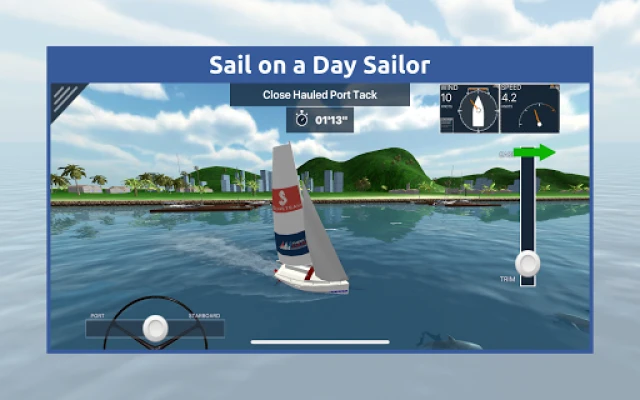 Then, put it all together when you sail around a course against the clock in a variety of different locations including the classic Harbor Tour course, a British Virgin Islands course, a Night Sailing Course that tests your navigation skills, a Tacking Master course that tests your tacking abilities, and more! We offer you the choice of three different boats - the day sailor, the cruising monohull and a beach catamaran. You can also choose between steering with a tiller or with a wheel! All the boats feature a mainsail and a jib, realistic wakes, and their behavior is based on real world polar data. In addition, we've made it easy to look around while you're sailing along - great for monitoring lay lines as well as checking out the scenery! As your sailing skills improve you’ll be able to earn awards for completing challenges in all the learning modules and sailing courses - can you earn the award for completing the Advanced level of the Points of Sail module without making any mistakes?