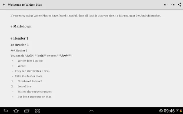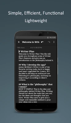 Writer Plus is a writing application without the fuss and distraction of a traditional word processor. Writer Plus is perfect for writing notes, novel, lyrics, poems, essay, draft on your phone or tablet.